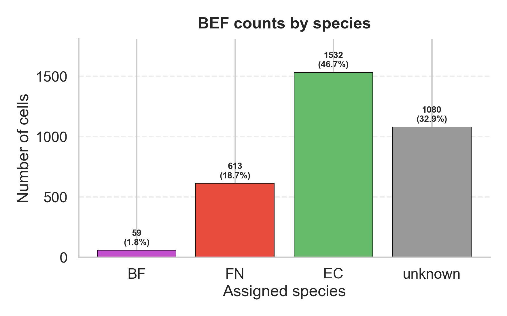 We used spatial and transcriptomic datasets for a defined three-member community of Fusobacterium nucleatum, Bacteroides fragilis, and Escherichia coli (Com3). Differential expression analyses and 3D FISH imaging revealed transcriptional shifts and architectural reorganisation driven by community composition.